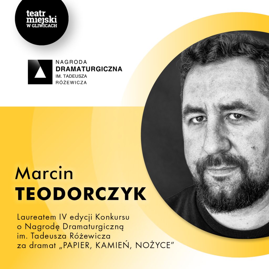 Z przyjemnością informujemy, że laureatem IV edycji Konkursu o Nagrodę Dramaturgiczną im. Tadeusza Różewicza został Marcin Teodorczyk, nagrodzony za dramat Papier, Kamień, Nożyce. Relacje z pogranicza.